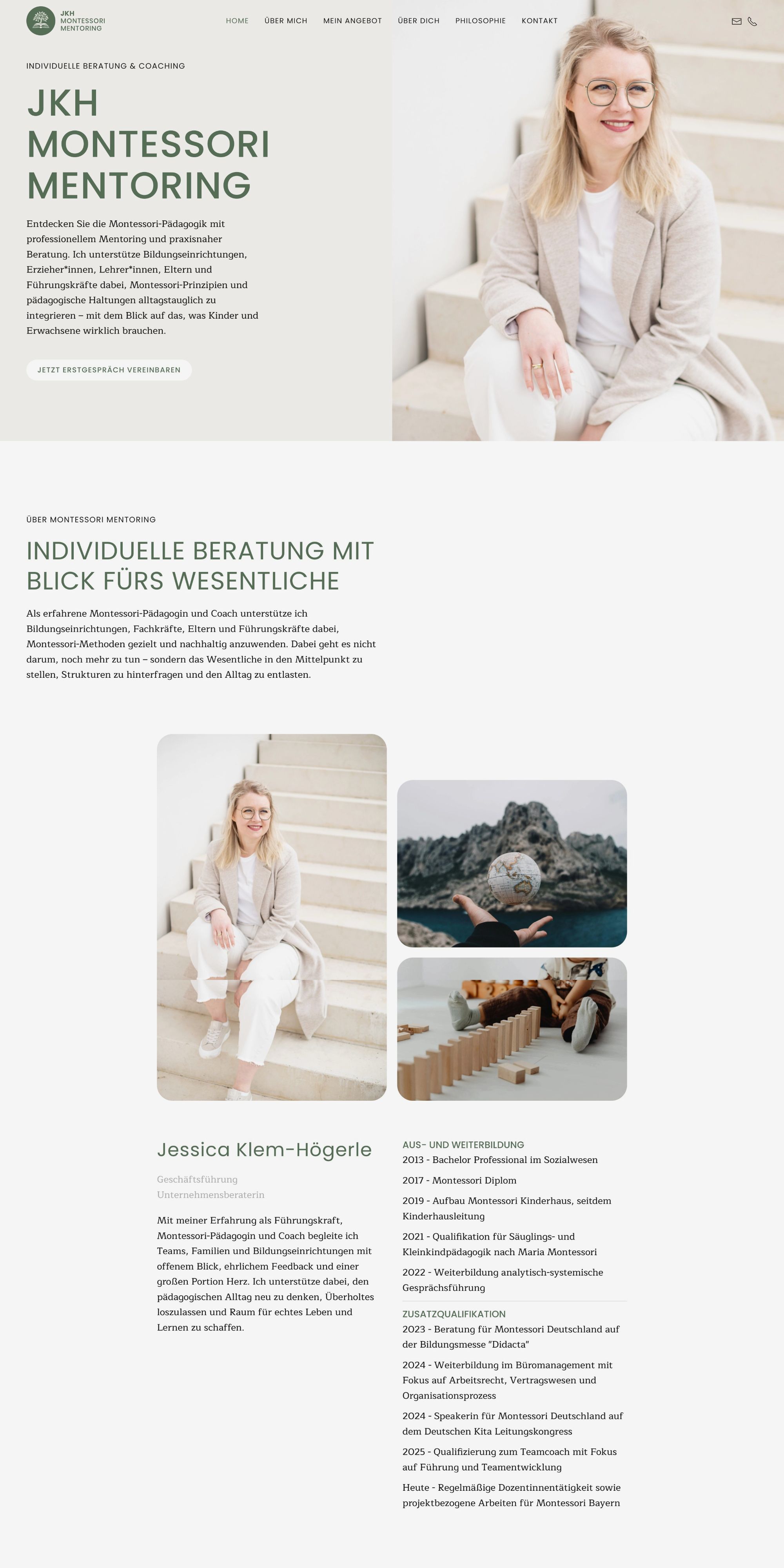 JKH Montessori Mentoring bietet individuelle Beratung und Coaching rund um die Montessori-Pädagogik. Die Gründerin begleitet Bildungsinstitutionen, Eltern, Lehrende und Führungskräfte dabei, Montessori-Prinzipien alltagstauglich und praxisnah umzusetzen – mit einem klaren Blick für das Wesentliche und die Bedürfnisse von Kindern und Erwachsenen.